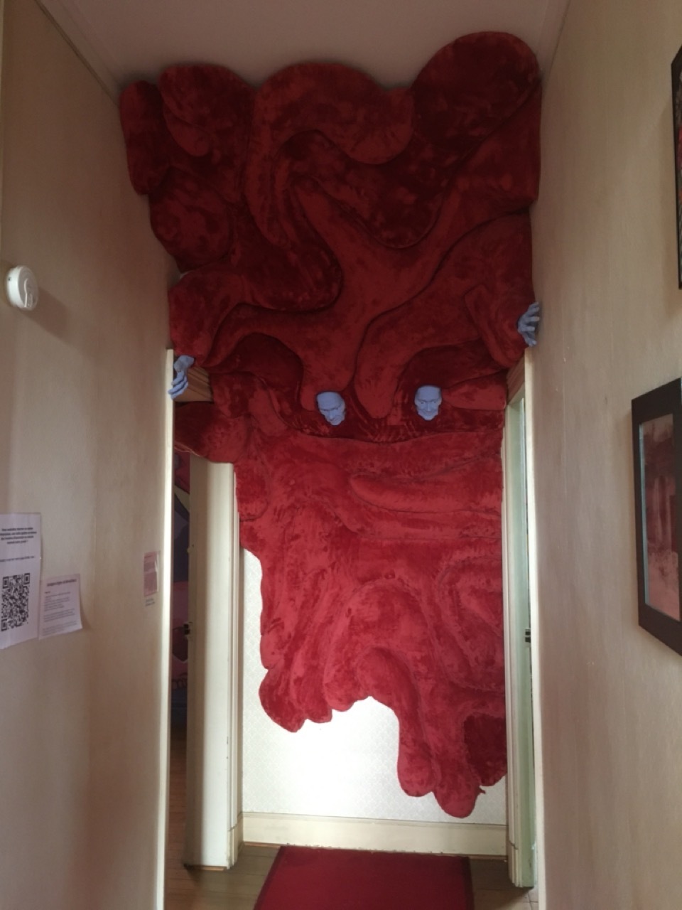 MCL : Là on arrive à dans un couloir. En fait, c'est très immersif, c'est à dire, ça arrive au dessus de nous. Une masse rouge, finalement à deux visages et deux mains bleues. Tu l'appelais le monstre de douceur, et je trouve ça intéressant parce qu'il y a c'est un peu inquiétant et en même temps, on a envie de se lover dedans. Voilà, donc ça donne cette sensation en bout de couloir. C'est un doudou, un doudou géant rouge.